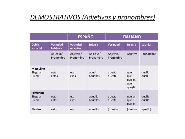 1 Pronombres demostrativos Son aquellos que indican la distancia relativa entre dos objetos, entre una persona y una cosa o entre dos personas, es decir, señalan ubicación A continuación les presentaremos los adverbios demostrativos Ejemplos Aquel escribe en su cuaderno Aquellos recogen manzanas Cercanía Distancia media Lejanía Singular. Hoy vamos a ver los pronombres y los adjetivos demostrativos en italiano Es decir, cómo se dicen palabras como “este”, “eso”, “aquella” tanto en el caso de que acompañen un sustantivo (como adjetivos) como si lo sustituyen (como pronombres) También puedes escuchar este post haciendo clic en el reproductor. Descripción de Los pronombres demostrativos en italiano ejercicio I Oggi mettiamo in pratica ciò che abbiamo imparato a proposito dei pronomi e degli aggettivi dimostrativi in italiano, inserendoli nelle rispettive frasi.