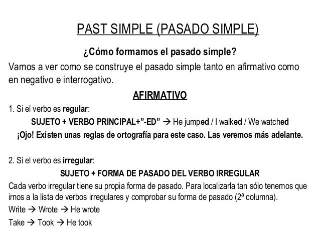 Simple past Se usa el pasado simple (el indefinido) cuando se quiere compartir nuestras experiencias y vivencias con otros En inglés (recuerda en que examenexam tienes todas las convocatorias de exámenes oficiales), existen pasado simple y pasado continuo Utilizando cualquiera de estos tiempos verbales podemos hablar sobre algo que ha ocurrido. Si queremos hablar en afirmativo de hechos que ya han terminado o de hábitos del pasado,. El pasado simple de la gramatica inglesa es cómo lo dice su propio nombre simple Trucos para entenderle en menos de 5 minutos.