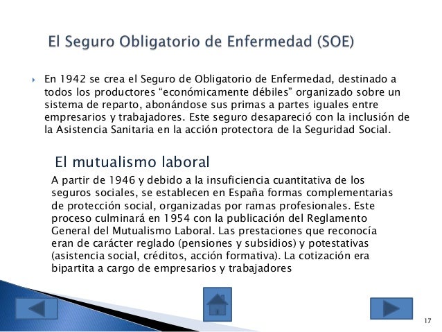 González Murillo, ‘El franquismo social’, 108 62 Gil Carretero, ‘El Seguro Obligatorio’, 64 63 Jordana de Pozas, Los seguros sociales, 161, attributes the deficit of 1949 and 1950 to a 25% increase in pharmaceutical costs and medical fees 64. El Seguro Obligatorio de Enfermedad (SOE) creado en 1942 (Ley de 14 de diciembre de 1942) 1 fue el primer régimen de protección de enfermedad, de carácter obligatorio, establecido en España Protegía a los trabajadores y sus familiares, en casos de enfermedad común y maternidad, con una prestación de asistencia sanitaria, una indemnización económica por la pérdida de la retribución derivada de los riesgos anteriores y una indemnización por gastos funerarios del. Abstract La responsabilidad técnica y política de la implantación del seguro obligatorio de enfermedad en España no se puede asignar, exclusivamente, a quienes redactaron y aprobaron la Ley de 14 de diciembre de 1942 (BOE, 27XII1942), durante la dictadura franquista;.