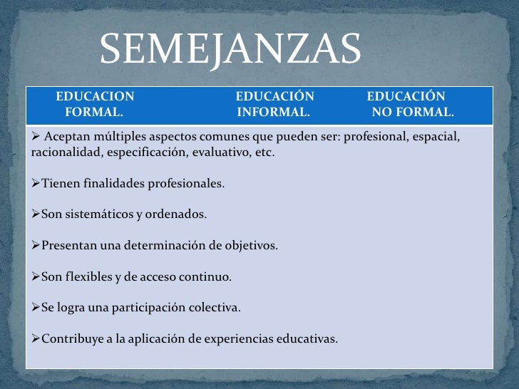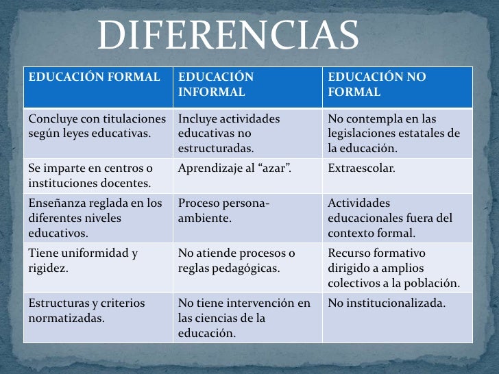 Un recorrido por la educación informal confrontada a esa otra educación que todos conocemos, la formal ¿Qué intencionalidad hay detrás de ella?. En consecuencia, tanto la educación no formal como la formal o reglada presentan la condición de ser procesos educativos, organizados, ordenados y sistematizados, mientras que esto no sucede con la educación informal A continuación, citaremos las principales características o particularidades de la educación no formal. En el ámbito de la política educativa se distingue frecuentemente entre aprendizaje (o educación) formal, informal y no formal La diferencia entre estas categorías, y especialmente entre las dos últimas (informal y no formal), no siempre es nítida y se presta a confusión, pero si nos remontamos hasta el origen de la distinción es posible comprender mejor las cosas a finales de los.