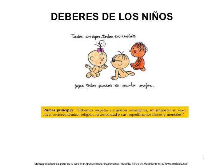 Los deberes enseñan a los niños a ser organizados y disciplinados A medida que tu hijo se hace mayor, va teniendo que cumplir cada día más compromisos y responsabilidades Los deberes escolares es uno de los más grandes pasos que tendrá que dar hacia la disciplina y el conocimiento. Honrar los símbolos patrios;. DERECHOS DE LOS NIÑOS Y NIÑAS Lean esto niños, les servirá para el proyecto e informe oral, de la clase de Estudios Sociales, que deberán entregar el lunes, 15 de diciembre En 19, la Asamblea General de las Naciones Unidas adoptó la Convención sobre los Derechos del Niño.