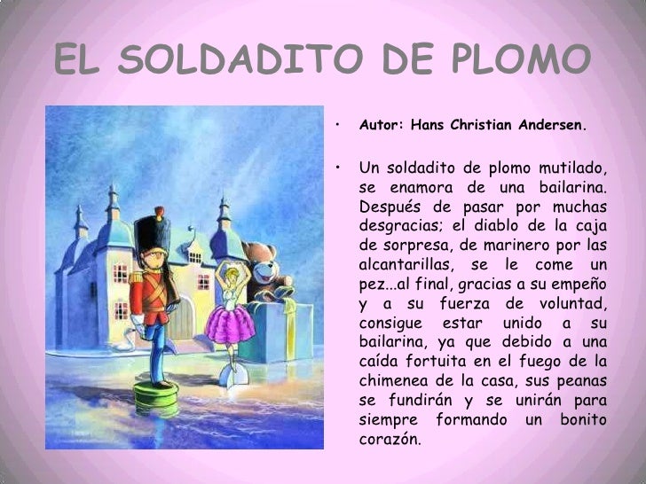 El soldadito de plomo es una conmovedora historia de amor infantil que fue escrito por el poeta Hans Christian Andersen en el año 18 En este articulo le mostramos un RESUMEN corto del cuento el Soldadito de plomo. 25ago17 Explora el tablero de The Steadfast Tin Soldier "El Soldadito De Plomo" en Ver más ideas sobre soldadito de plomo, soldado, lecturas para segundo grado. —El pez había sido pescado, llevado al mercado y vendido;.