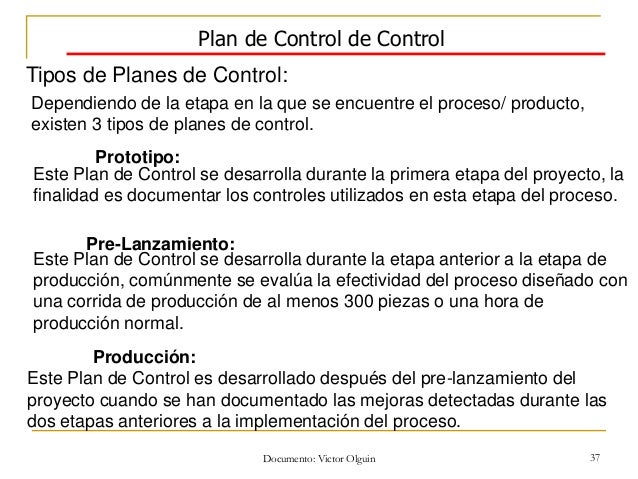 • Plan Nacional de Control de infecciones CITB en Hospitales Referenciales • Identificar servicios de mayor riesgo de transmisión TB • Implementar Planes de CITB CITB en Hospitales Referenciales • Entrenar en una primera fase a personal de PCT, neumología, emergencia, UCI, laboratorio,. A Control Plan is a method for documenting the functional elements of quality control that are to be implemented in order to assure that quality standards are met for a particular product or service The intent of the control plan is to formalize and document the system of control that will be utilized. Este tutorial te explica como hacer un plan de auditoria.