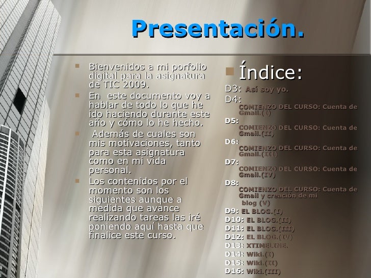 Un portafolio electrónico básico contiene una colección digital de artefactos tales como perfiles personales, archivos, publicaciones, ideas, reflexiones y logros, entre otros, sobre un individuo o una institución que se acumulan con el tiempo. Editor 6 Ejemplo Cómo crear un Portafolio personal Nelly Actualización 11 de agosto de 15 1639 Seguir Tutorial avanzado para diseñadores sobre cómo crear un portafolio en línea para mostrar tu trabajo Puedes echarle un vistazo al sitio web. En la elaboración del porfolio personal ser consciente de lo que se sabe y de lo que queda por aprender, de cómo aprende y de cómo gestiona sus procesos de aprendizaje Reflexionar con acierto sobre los progresos y carencias de todas y cada una de las evidencias mostradas en el mismo.