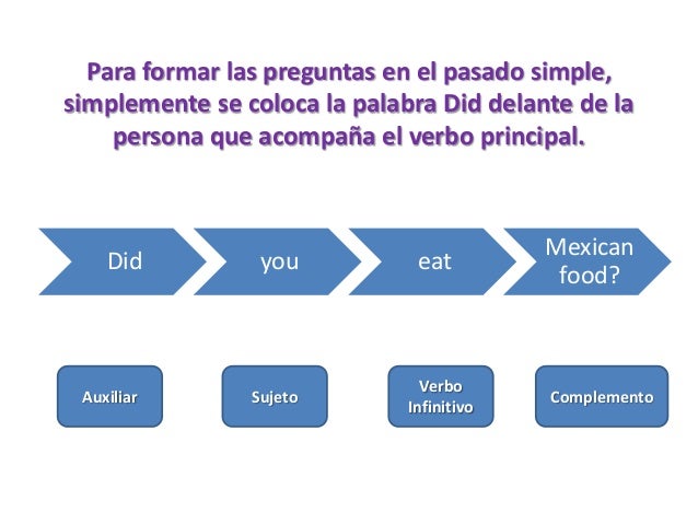 Pasado simple ingles en Preguntas 1 PASADO SIMPLE PREGUNTA 2 Para formar las preguntas en el pasado simple, simplemente se coloca la palabra Did delante de la persona que acompaña el verbo principal Did you Auxiliar Sujeto eat Verbo Infinitivo Mexican food?.