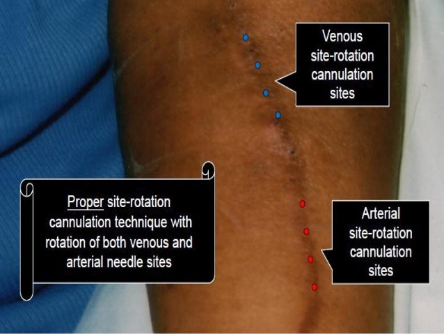The rope ladder technique is the method of cannulation most often used in dialysis clinics With this technique, the needle insertion point is not the same every time Instead, the needle is inserted about a half inch from the place it was inserted during the last dialysis treatment. In the UK, both buttonhole and rope ladder technique are cannulation techniques recommended by the Renal Association, as both techniques are associated with prolonged fistula life span (11) Buttonhole technique involves cannulating an arteriovenous fistula vein in exactly the same place each time. Access Cannulation • A well functioning vascular access for hemodialysis is critical to the success of the treatment • 2 options for cannulation •Buttonhole (constant site, same site – not to be confused with same general area), •StepLadder (ropeladder, rotating site).