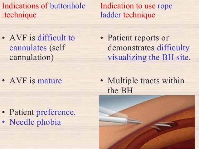 With area cannulation, there is a high risk of aneurysm formation, and these are now frowned upon Rope ladder method (where the cannulation sites are distributed along the entire length of the AVF) is the commonest technique used for AVF cannulation Buttonhole cannulation, on the other hand, has a checkered history (see a recent review for. Abstract Background The buttonhole technique is an alternative method of cannulating the arteriovenous fistula (AVF) in hemodialysis (HD), frequently used for home HD patients However, the balance of risks and benefits of the buttonhole compared with the ropeladder technique is uncertain Study design A systematic review of randomized trials and observational studies (case reports, case series, studies without a control group, nonEnglish studies, and abstracts were excluded). From 1 January, 1990 to 1, January, 1998 ropeladder cannulation (RLC) was used in the unit After skin disinfection, sharp needles were inserted in a different site at each HD session After 1 January, 1998 onwards, all the patients were progressively switched to BHC within 3 months Access area was carefully disinfected after soap wash.