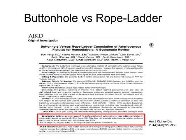 Successful cannulation of arteriovenous fistulas (AVFs) is a key priority to maintain the vascular access for hemodialysis, prevent vascular accessrelated morbidity, and avoid discomfort associated with AVF needling Contrary to the rope ladder method of AVF cannulation, in the constant site or buttonhole technique, blunt needles are inserted at the same sites at each session, with the same. Buttonhole and rope ladder techniques were developed to reduce complications However, studies that compare these two techniques report disparate results This systematic review performs an indepth exploration of RCTs, with a specific focus on cannulation as a complex intervention. Consequently, ropeladder cannulation should remain the standard of care and buttonhole cannulation should only be used in rare circumstances (eg short segment AVFs where the only alternative is.