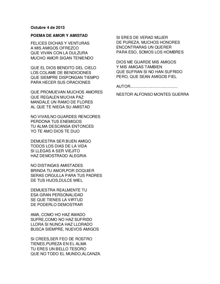 En el amor y la amistad (de ahí el nombre de esta colección de poemas) Han participado autores, aunque destacan cinco jóvenes que encuentran en la escritura de poemas una forma de canalizar sus emociones, de desarrollar su creatividad y de dar uso de forma activa a su tiempo libre. Poemas de amistad Por Fabio Última actualización Nov 4, Hermosos poemas de amistad cortos para compartir en redes sociales y/o Whatsapp Los versos bonitos de amistad son perfectos para manifestar nuestro cariño, esperamos puedan disfrutar de estos pequeños poemas para amigos. La amistad, cuando es sincera, es un soporte moral y espiritual que nos hace muy afortunados A diferencia de las parejas, los verdaderos amigos están en las buenas y en las malas, y sus consejos o simplemente sus palabras de aliento, pueden reparar un alma hecha pedazos En honor a ellos, hemos recopilado 10 poemas sobre la amistad que te harán querer enviárselos de inmediato a todos esos amigos, a todos esos hermanos de la vida.