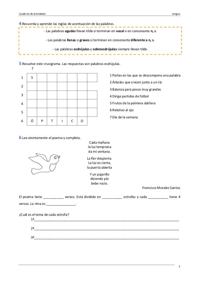 6º Lengua Un repaso de Gramática 6º Mates U0 6º Mates U1 Ejercicios 6º Mates U2 Anexo Ejercicios 6º Mates U3 La evolución (por Miguel, Román, Adriana y Pablo A) Acuérdate del adjetivo con esta presentación El adjetivo Recuerda los determinantes en esta presentación, y descubre todos sus secretos. Realice los ejercicios interactivos con autocorrección online para mejorar sus conocimientos de la lengua española Todos estos ejercicios de español disponen de autocorrección, es decir, usted puede comparar inmediatamente sus respuestas con las soluciones. Solucionario y ejercicios de acentuación con soluciones Descargar en pdf La acentuación es un tema de suma importancia para poder entender y transmitir a ciencia cierta lo que las palabras quieren decir, si llegas a equivocarte podrás estar cambiando de manera dramática todo el sentido de una frase o de un párrafo completo De allí la importancia de conseguir el perfecto y total.