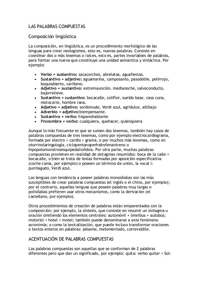 The teacher labeled her as a hyperactive kid;. Las palabras compuestas tienen más de un morfema libre Compound words have more than one free morpheme Una maniobra frecuente en odontología es polimerizar distintos tipos de compuestos dentarios para prótesis Los compuestos de flúor actúan sintomáticamente,. Ejemplos Corta Uñas Ante ojos Para aguas Las Palabras Compuestas Las Palabras Compuestas Son palabras que se forman por la unión de dos o mas palabras simples Formación de Palabras Compuestas Reglas de acentuación 1Sustantivo Sustantivo 2Sustantivo Adjetivo.