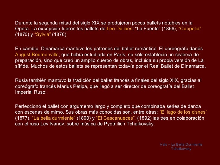El siglo XIX es la era del ballet y de la música romántica El culto de la personalidad, el sentimiento trágico de enfrontarse al destino por un ideal, por ejemplo, el amor o la política, permea la danza de la época Obras como Giselle o El Cascanueces, testimonian está sensibilidad El Gran pas a quatre, que reunía a las cuatro. Los diálogos, el drama, muy por debajo, aun superficiales, siervos del show Aunque actúa en dramas o comedias, sin la aparición del agua, no era lo mismo. Cuando vemos a las bailarinas de ballet a parte del baile y la presentación siempre notamos el calzado que están llevando;.