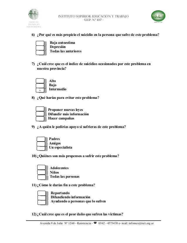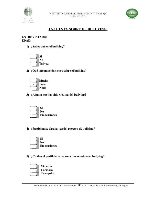Un estudio cualitativo sobre convivencia escolar El Bullying desde la perspectiva de las Víctimas permitiera la privacidad y se empleó un cuestionario de cinco preguntas, con el fin. La intimidación es una cuestión delicada, la razón por la que debe mantener un ojo en la seguridad de los estudiantes y compartir una encuesta de intimidación periódicamente con sus estudiantes y miembros del personal 123FormBuilder es un creador de formularios en línea que le ayuda a crear una encuesta de intimidación rápida y fácil, sin necesidad de habilidades de programación. EL ACOSO ESCOLAR (“BULLYING”) Preguntas & Respuestas ¿Tiene Ohio una ley que prohíbe el acoso en las escuelas?.