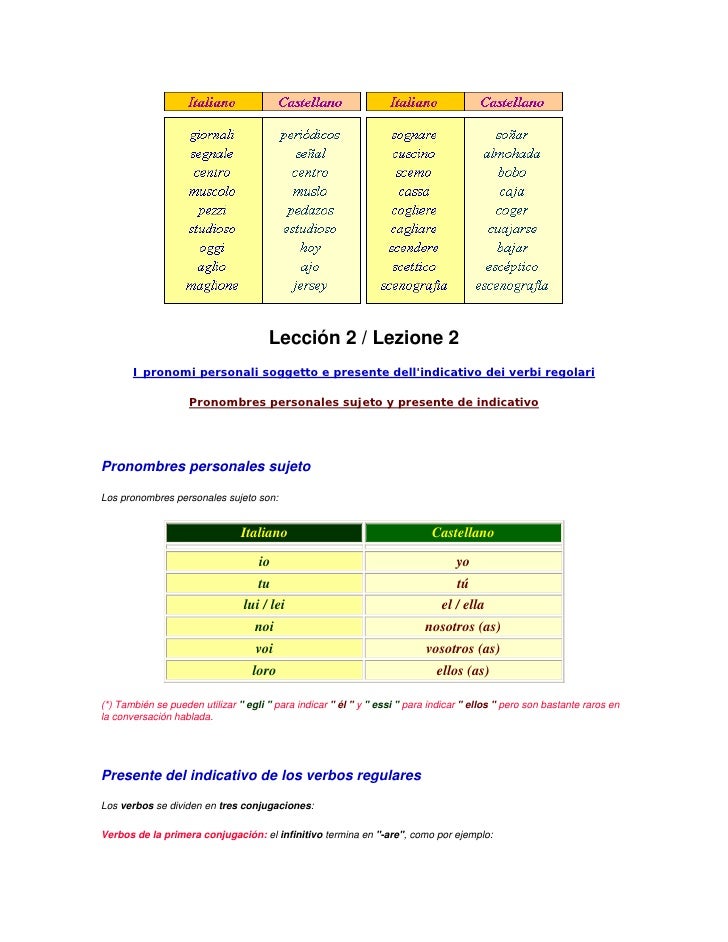 1 En el lenguaje comercial se suele usar voi en lugar de Lei 2 Muy poco utilizado en la lengua hablada 3 Forma que corresponde al interlocutor o a los interlocutores (segunda persona del discurso) pero que gramaticalmente concuerda con la tercera persona de la flexión verbal Como se observa en la tabla anterior, el italiano dispone de ciertos pronombres personales sujeto que son usados. 8 Verbo "avere" (presente simple) 9 Decir Sí y No en italiano. Verbo ser y los adjetivos Il verbo essere e gli aggettivi / El verbo ser y los adjetivos Sonido.