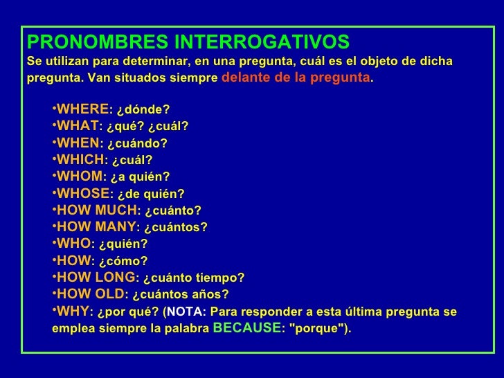 Los pronombres interrogativos en inglés Al igual que los adverbios interrogativos en español, los pronombres interrogativos en inglés se usan para hacer una pregunta abierta sobre un lugar, una duración, una razón, una manera de hacer algo, una persona o una cosa Además, son palabras invariables (su forma no cambia). Adjetivos y pronombres interrogativos Ejercicios {ejerciciocompletar} is co 1) is she?. 24jun18 Explora el tablero de david peña "pronombres interrogativos" en Ver más ideas sobre pronombres interrogativos, vocabulario en ingles, clase de inglés.