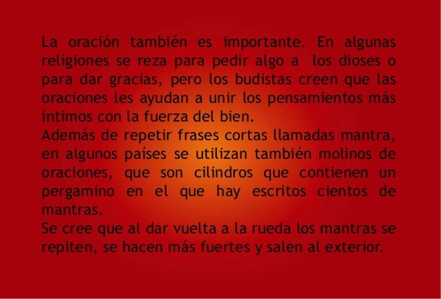 03nov17 Explora el tablero de Annabel Lee "Budistas" en Ver más ideas sobre budistas, budismo, monja. Las oraciones budistas se pueden practicar de forma libre, siempre y cuando se usen bajo el principio de agradecimiento u ofrecimiento Las oraciones budistas no pueden ser utilizadas a modo personas, egocéntrico, egoístas o anhelando un bien material Las oraciones budistas se caracterizan por estar destinadas a un elemento de devoción o mándala, y pueden practicarse o recitarse en. Se llama mantra a una oración corta de origen hindú y budista, con vibraciones sonoras que se recitan para calmar la mente, alcanzar la tranquilidad y la iluminación;.
