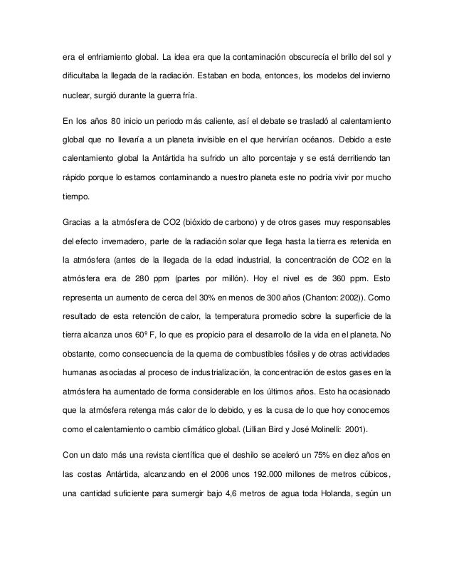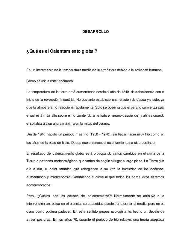 Ensayos relacionados Calentamiento Global Origen del calentamiento global Los Gases de Invernadero La atmósfera terrestre está conformada por numerosos gases, los mayoritarios, como es de conocimiento común, son el 3 Páginas • 24 Visualizaciones Calentamiento Global Actualmente cada vez cobra mayor ímpetu en la opinión pública, los medios de comunicación, la política y la. Argumentan que aunque la temperatura varía de forma natural con el tiempo, está aumentando a un ritmo sin precedentes Esas son las más. Los tiburones, nuevas víctimas del calentamiento global Estos animales, depredadores que mantienen saludables los ecosistemas oceánicos, no solo son víctimas de la pesca ilegal Según un estudio, por el calentamiento de los océanos, sus bebés nacen más pequeños, agotados y desnutridos.