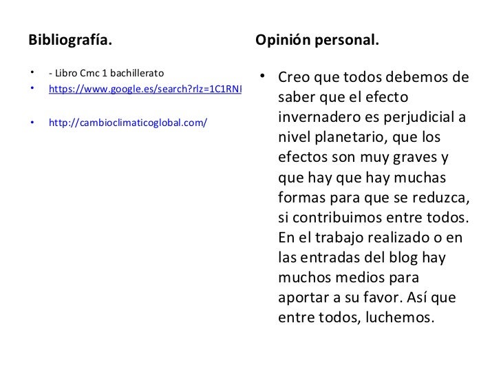 Opinion Personal El calentamiento global esta producido por todos nosotros por nuestros descuidos e inconsciencia de lo que pasa a nuestro alrededor Lo mínimo que nosotros podemos hacer es respetar nuestro alrededor porque todo cuenta para nuestro planeta por muy mínimo que sea el el esfuerzo. Opiniones sobre calentamiento global Este blog fue creado con el fin de dar a conocer a las personas de el daño que le estamos haciendo al mundo con el calentamiento global;. Era muy dividido Menos del 50% de las personas creen en su existencia;.